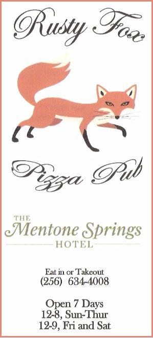 The Mentone Springs Hotel offers two restaurants, with Alice's being open for dinner Friday-Saturday 6-9 and for lunch Saturday and Sunday 11-2. The Rusty Fox is open 7 days a week at noon.