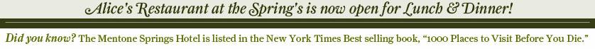 May 10, 2013---Mentone, Alabama---Owners of the Mentone Springs Hotel today announced that its restaurant, Alice's, has opened in preparation for the seasonal influx of tourist and visitors. It will be open for dinner on Friday and Saturday night... more